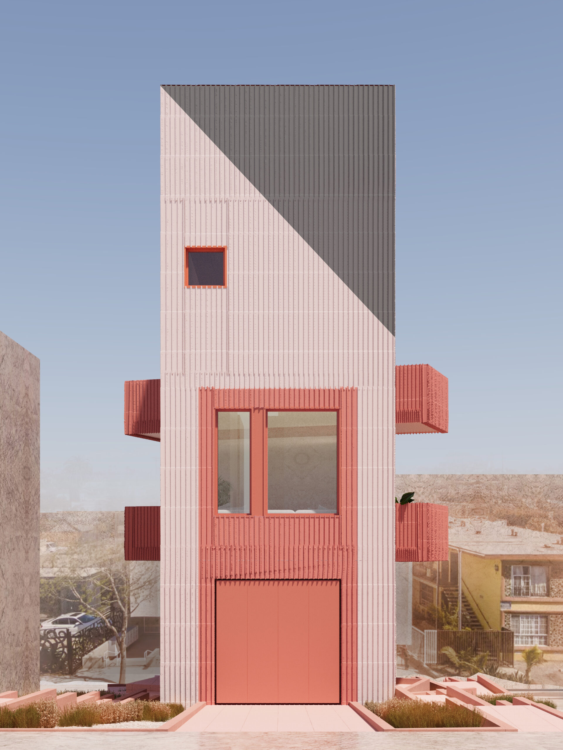 Their project Slim GIM (Gradually Inclined MultiFamily) reconsiders the residential duplex typology within a tall and skinny volume punctured by exterior balconies and bold color play. Taking advantage of the long lot and generous height limit, the narrow structure pulls away from the side setbacks for increased access to light and air within its interiors. In part a fire-separation strategy and in part an exercise in compact density, the bar volume houses two multi-level primary units stacked atop a one-car garage and a JADU for increased programmatic flexibility and income generation. The compact footprint is lodged into the sloping hillside, firmly rooting the house in the ground. The drought tolerant landscape of cascading terraces, retaining walls, stairs and ramps provides defensible space, acting as a hardscape break and aids in water-retention strategy during scarce but increasingly severe rainstorms.