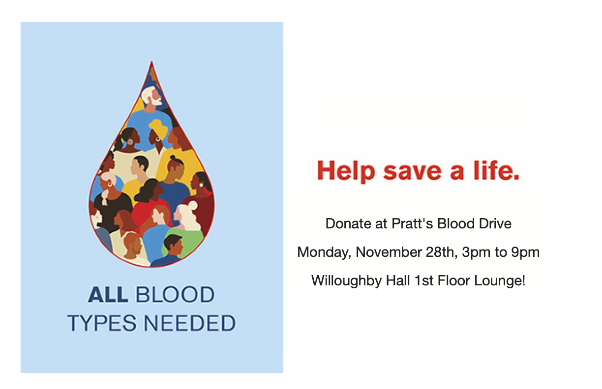 Pratt is hosting our first post-pandemic Blood Drive one week from today, Monday, November 28th, 3pm to 9pm on the 1st floor of Willoughby Hall, in the “No Name Café” (off the lobby, past the piano).