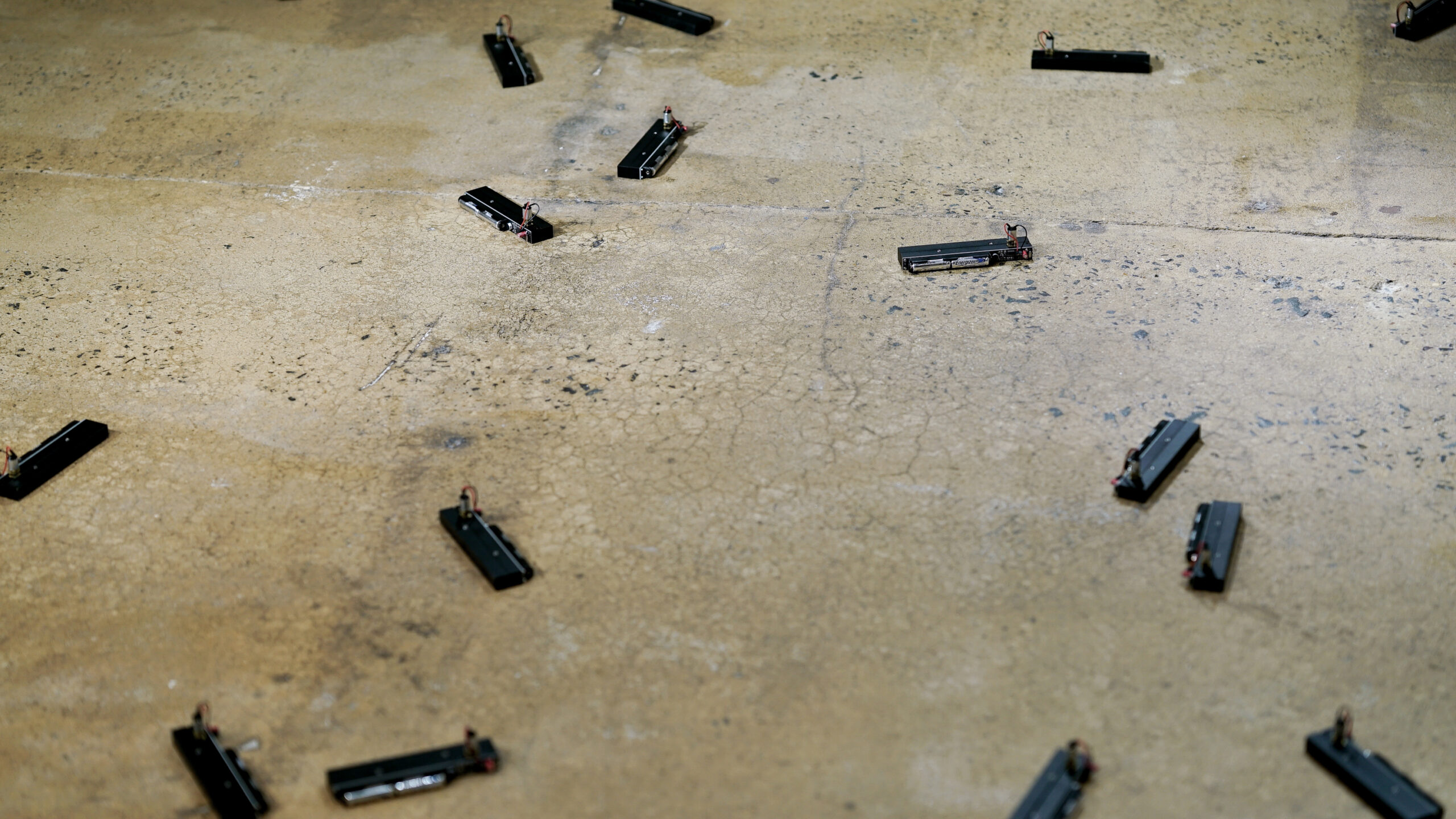 “100 Clapping Machines” is an indoor installation of a hundred individual clapping machines, sometimes clapping in unison, sometimes seemingly randomly. Visitors are encouraged to interact with the installation by making sounds (clapping or stomping).