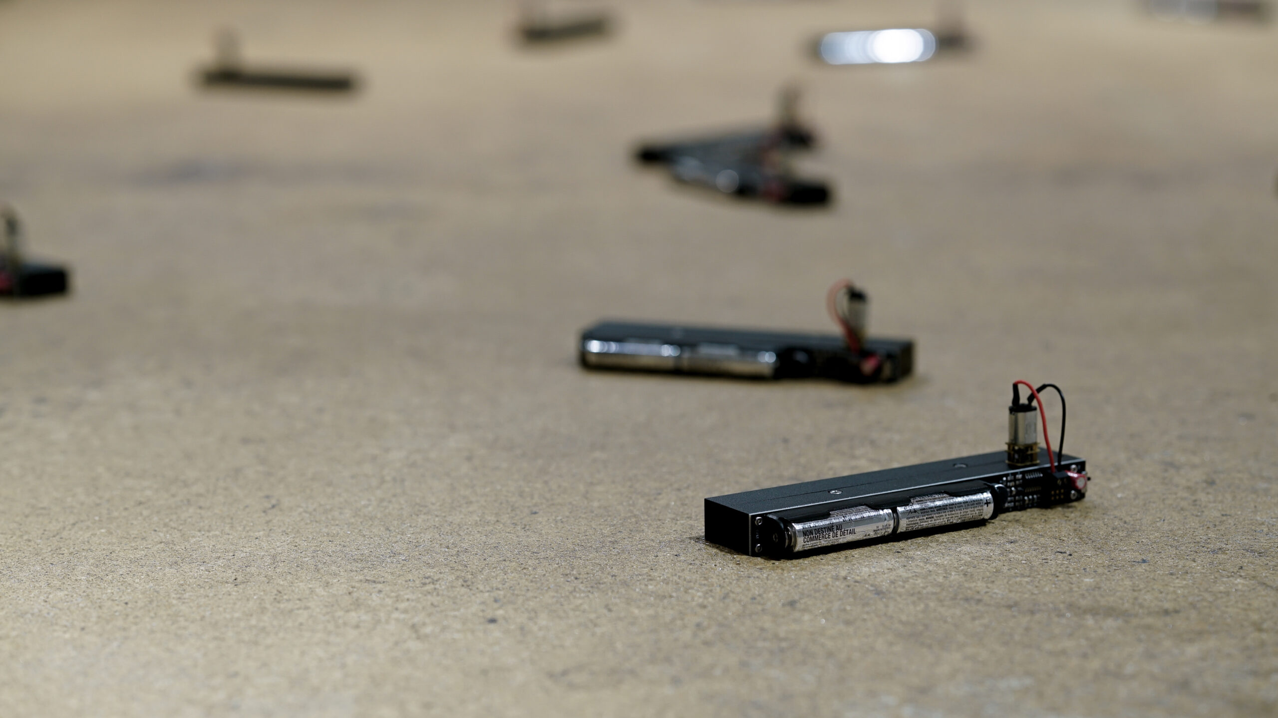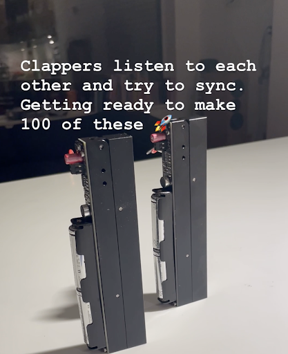Each clapper claps on a time interval, but will also adjust its phase (i.e. time delay) as it listens to match its neighbors’ claps, similar to how some species of fireflies synchronize their flashing. Each clapper has a small microcontroller, a piezo (acting as a microphone), a motor with a cam, and a spring to actuate two blocks of aluminum that hit each other to clap.