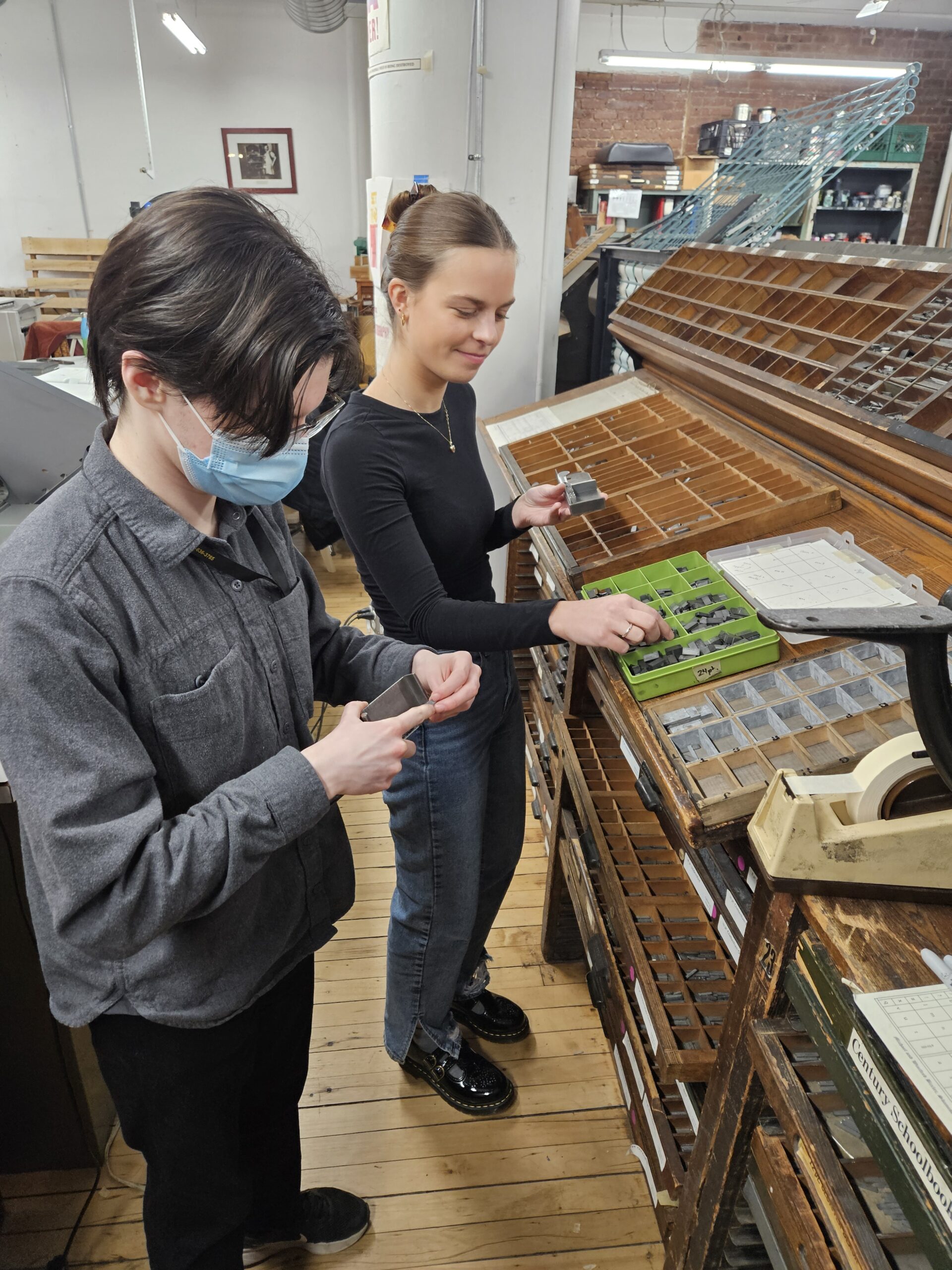 Isabel Brandt (right) selects metal type for the letterpress. -