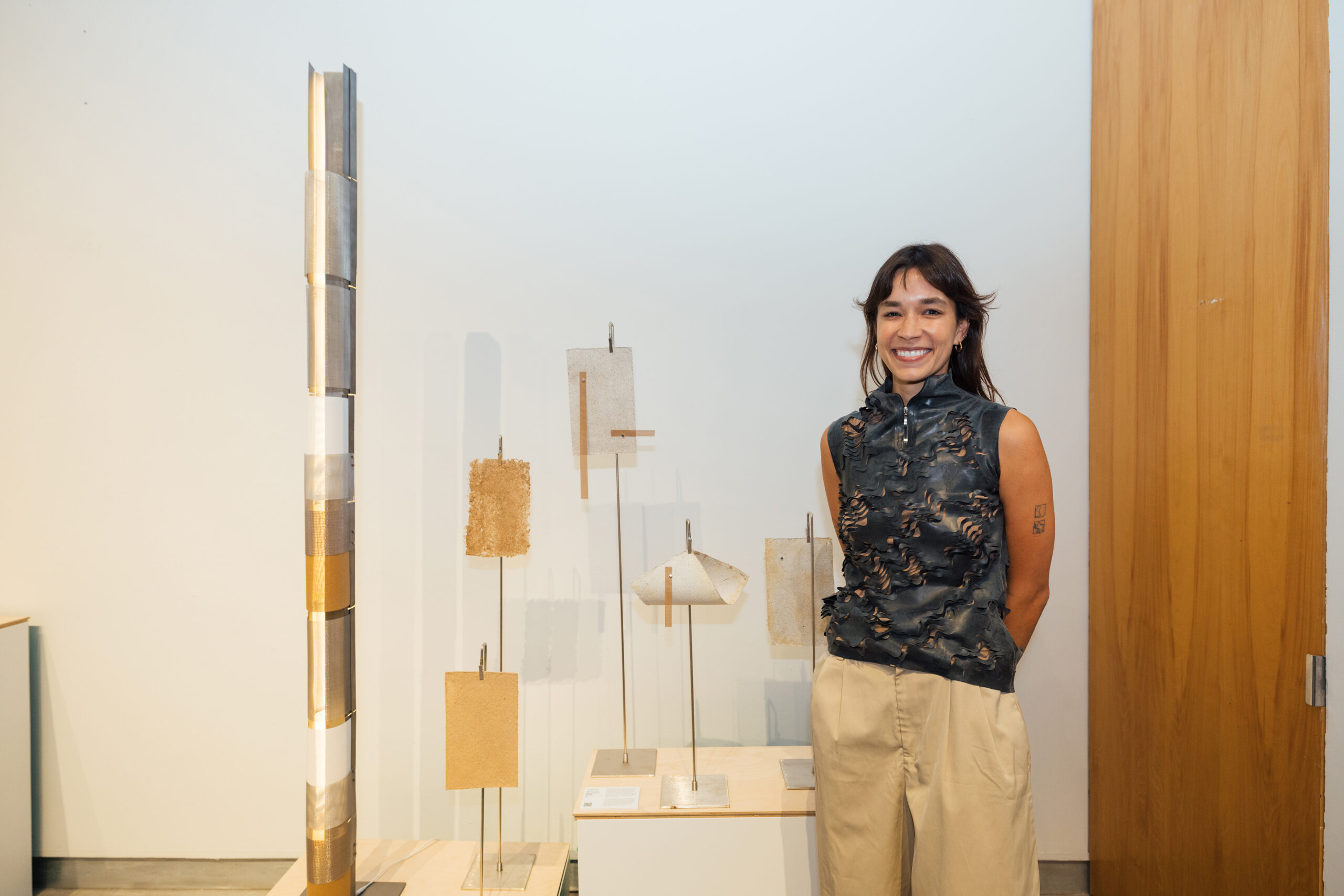 In addition to awarding a prize recipient, the jury recognized two projects with honorable mentions. Magnetic Dust, by Gabriela Mestriner, MID ’26, transforms steel dust—a byproduct of metal fabrication—into handmade papers with subtle magnetic properties. Using material collected from Pratt’s Production Labs, blended with recycled pulp, the sheets develop rust-colored tones through natural oxidation, resulting in papers that are both flexible and durable. Jurors commended the project for its playfulness and the sense of serendipity embedded in its discovery process.