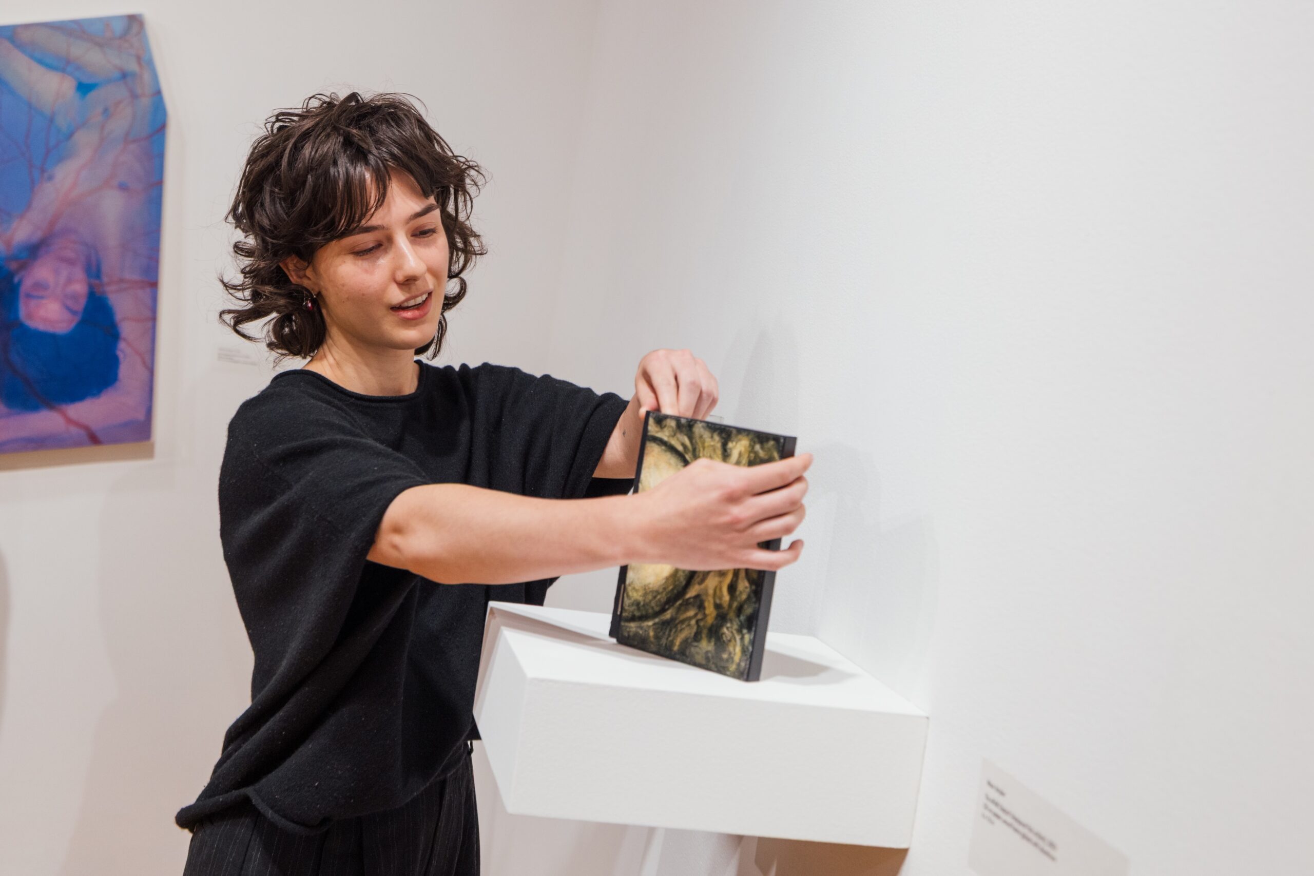 Wren Stryker, BFA History of Art and Design ’26, exhibited their piece The AFAB Diptych (Assigned Fish at Birth) (2023), a diptych altarpiece of grotesque fish women. Stryker appreciated working with the curators to represent their painting in a group exhibition context, noting how, “They put everything in conversation with each other in a representative and illuminating manner.”