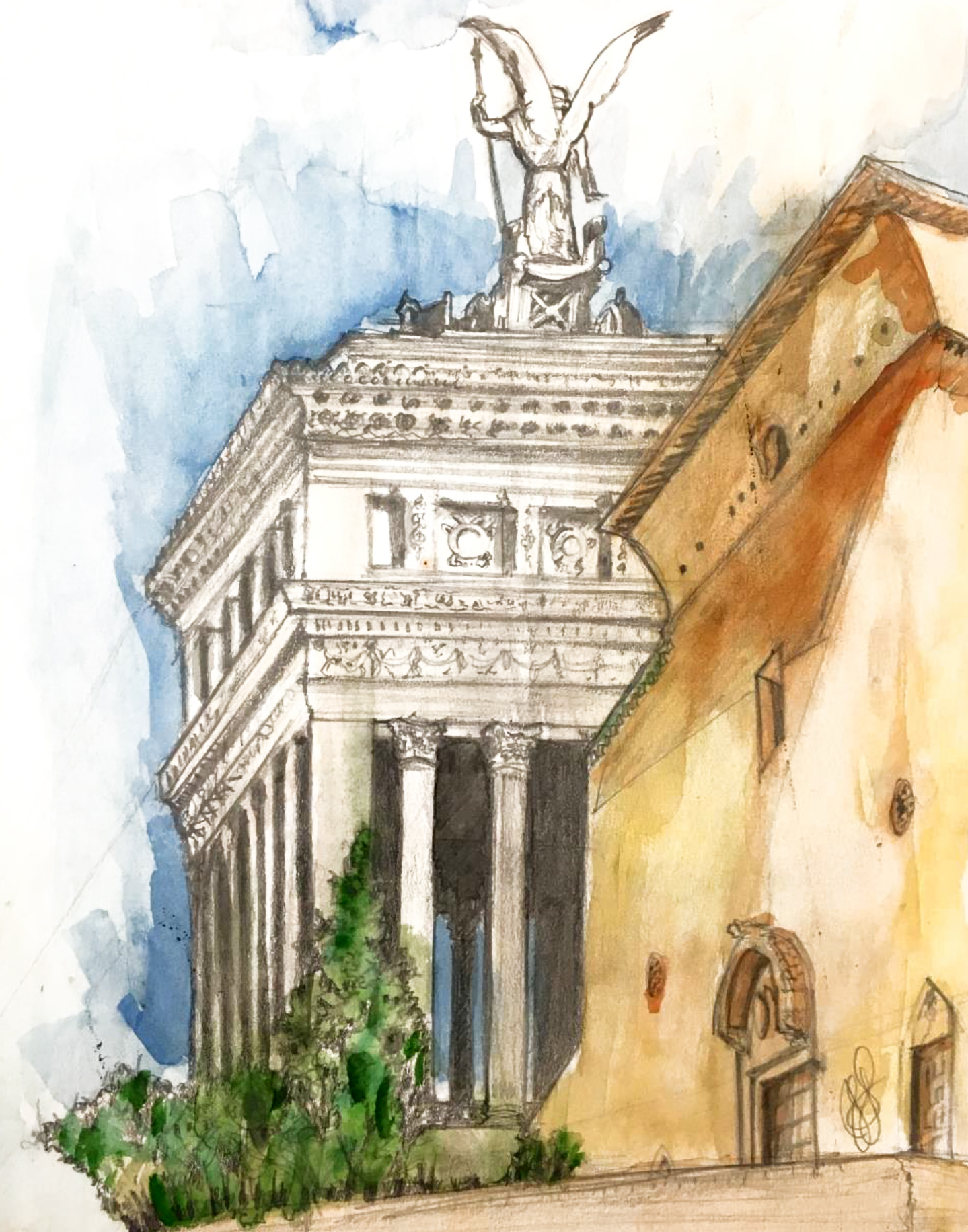Now, as the program recognizes its history, it also looks to its future, newly under the academic direction of Federica Vannucchi, adjunct associate professor of undergraduate architecture, who will give a public lecture, Laboratorio Roma, on September 21. Vannucchi succeeds Richard Piccolo, BID ’66, adjunct associate professor – CCE of undergraduate architecture, who has led the program since its inception in 1974, two of whose drawings from Rome appear below. (A unique aspect of Piccolo’s teaching, says Pratt Rome Program Coordinator Frederick Biehle, adjunct professor – CCE of undergraduate architecture at Pratt, “is that while he demonstrates and critiques he also sets an example by drawing alongside the students.”)