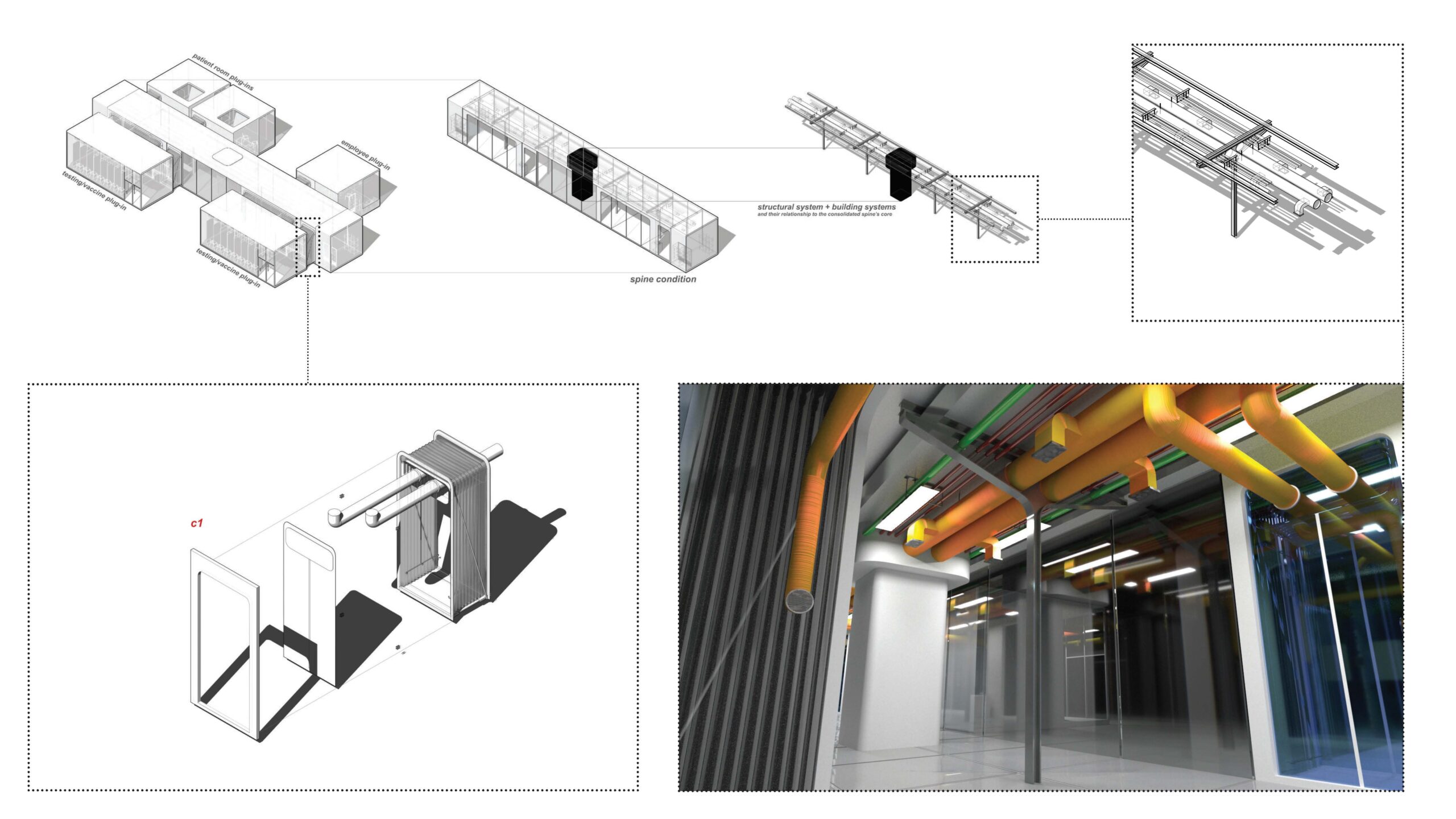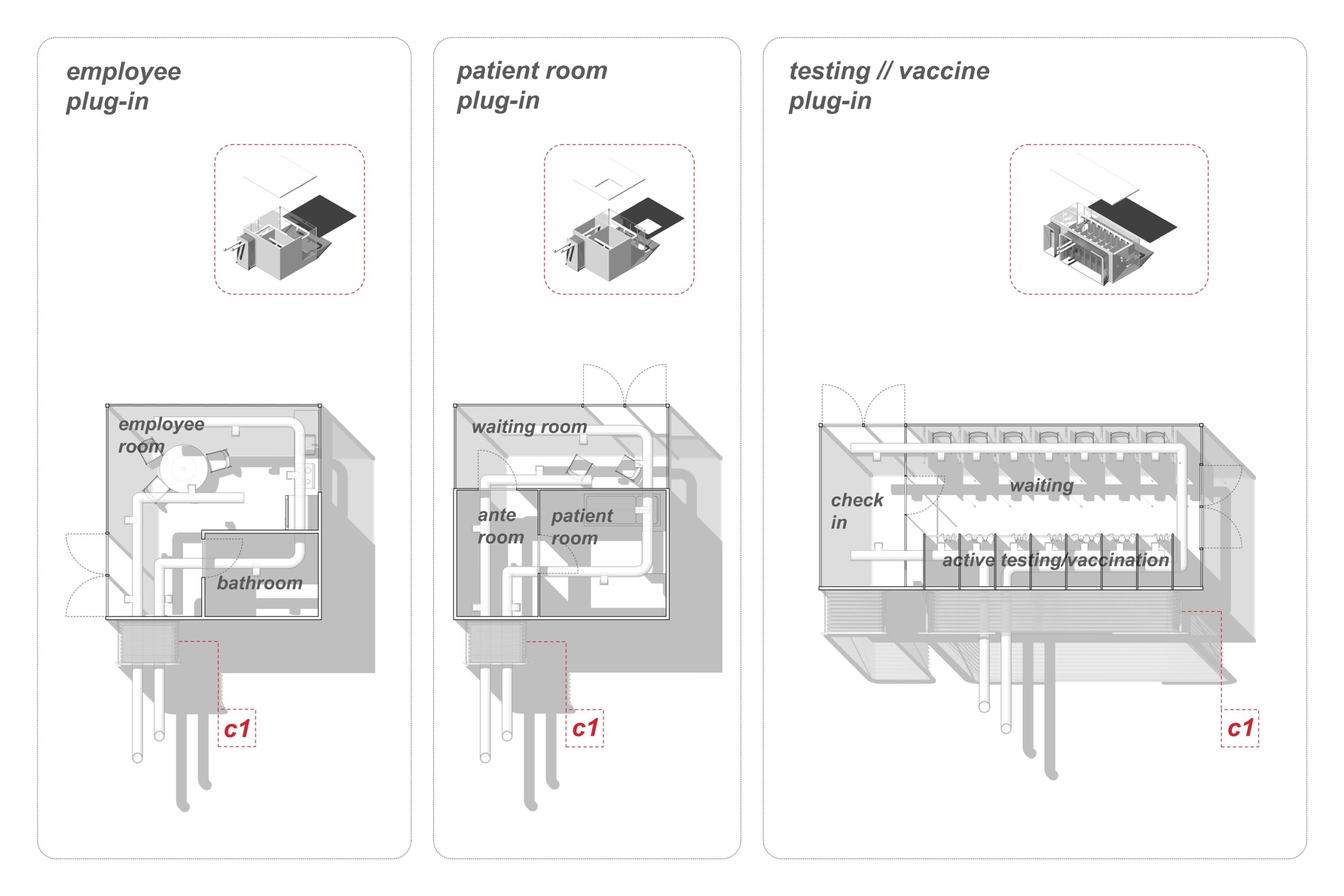 In an approach that prioritizes clarity, a central spine accommodates a series of “plug-ins,” spaces whose use is clearly designated for patients coming in for testing or vaccination, patients who are ill, and employees conducting various forms of clinical work. With features such as exposed pipelines and glass partitions, the proposal, in Kim’s words, “focuses and prioritizes the transparency of information, in the form of architecture and healthcare infrastructure, as an act of care,” to reassure patients and staff alike that they are safe.
