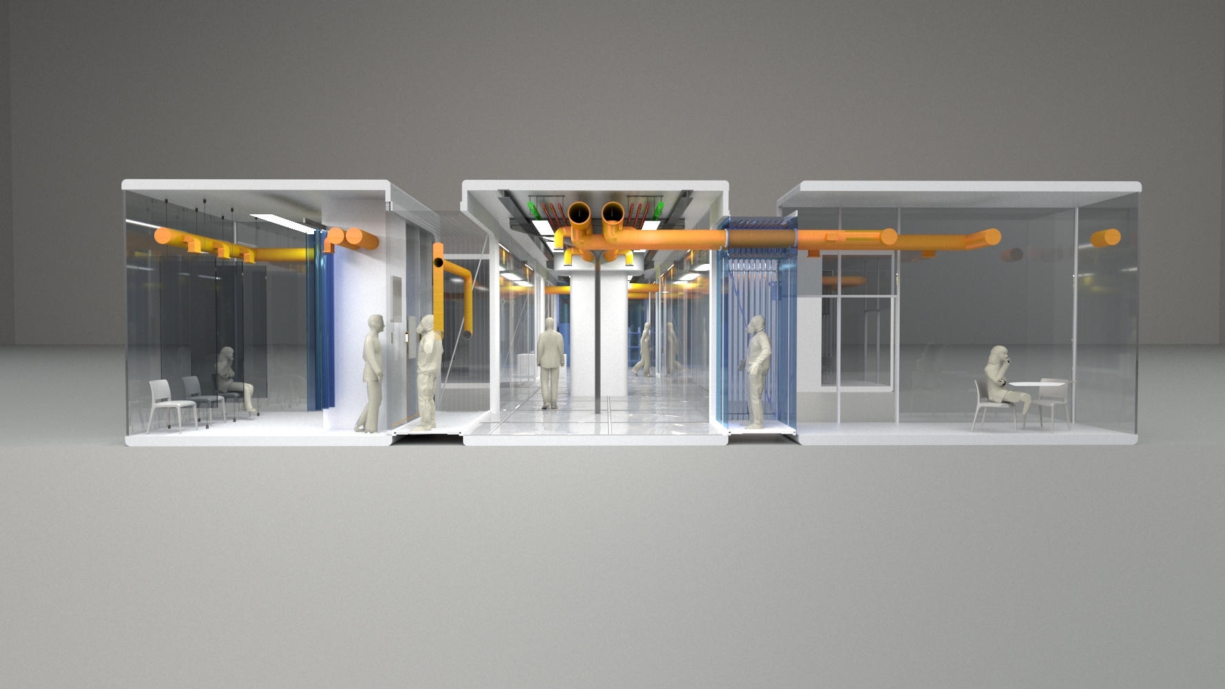 This clinic would comprise several modules, for preventive care—testing and vaccination—and active care—reception, labs, storage, and patient rooms—with distinct outdoor areas for patients to wait, staff to receive deliveries, and clinicians to come and go. Smith also suggested that the structure could expand and include zones for reflective space for caregivers, “a neutral space of empathy, so physicians have the ability to restore their mental health as they fight against the virus.” For the safety of its occupants, each module houses its own airflow system, using displacement ventilation, which feeds fresh air in at floor level to push contaminated air up and out via exhaust ducts.