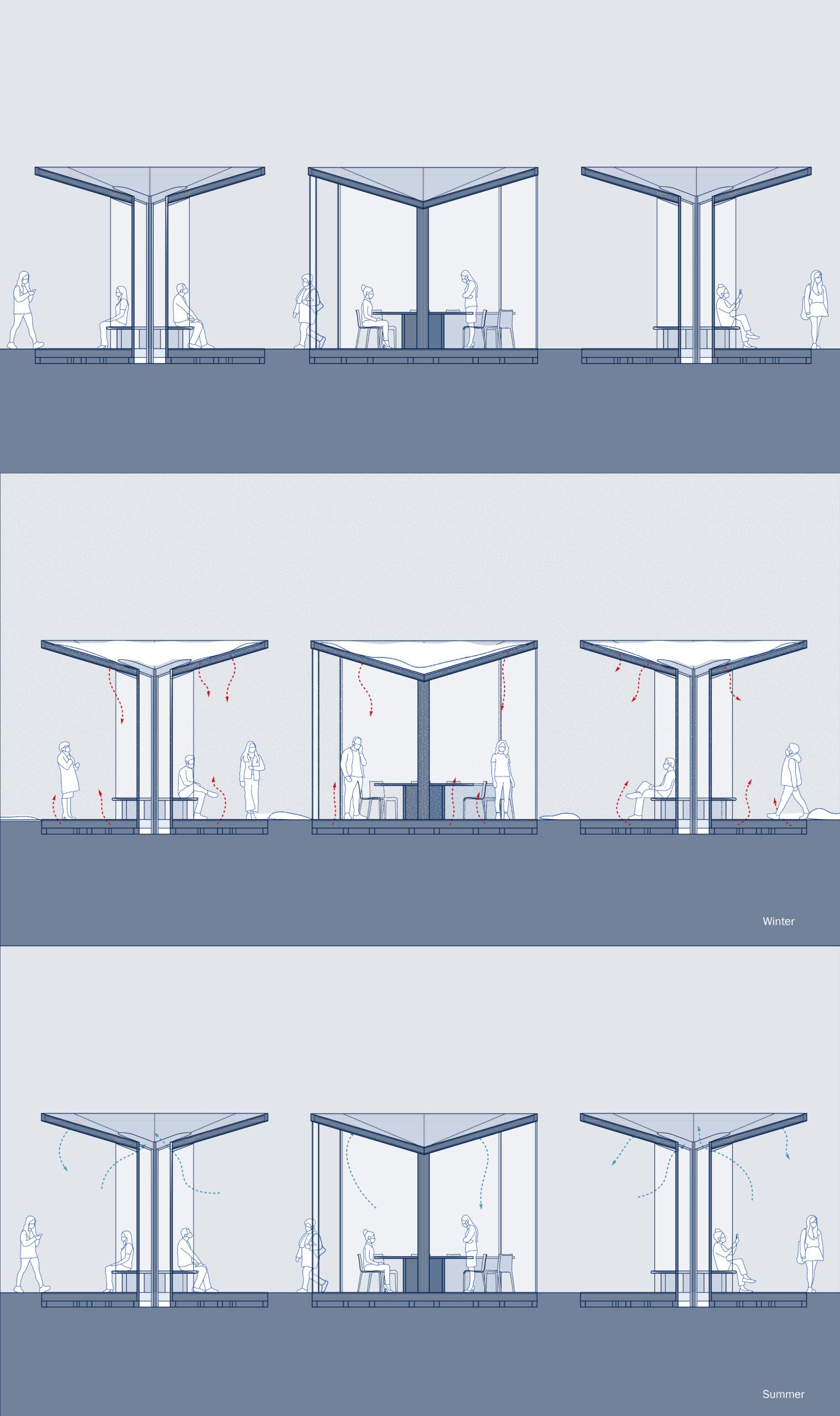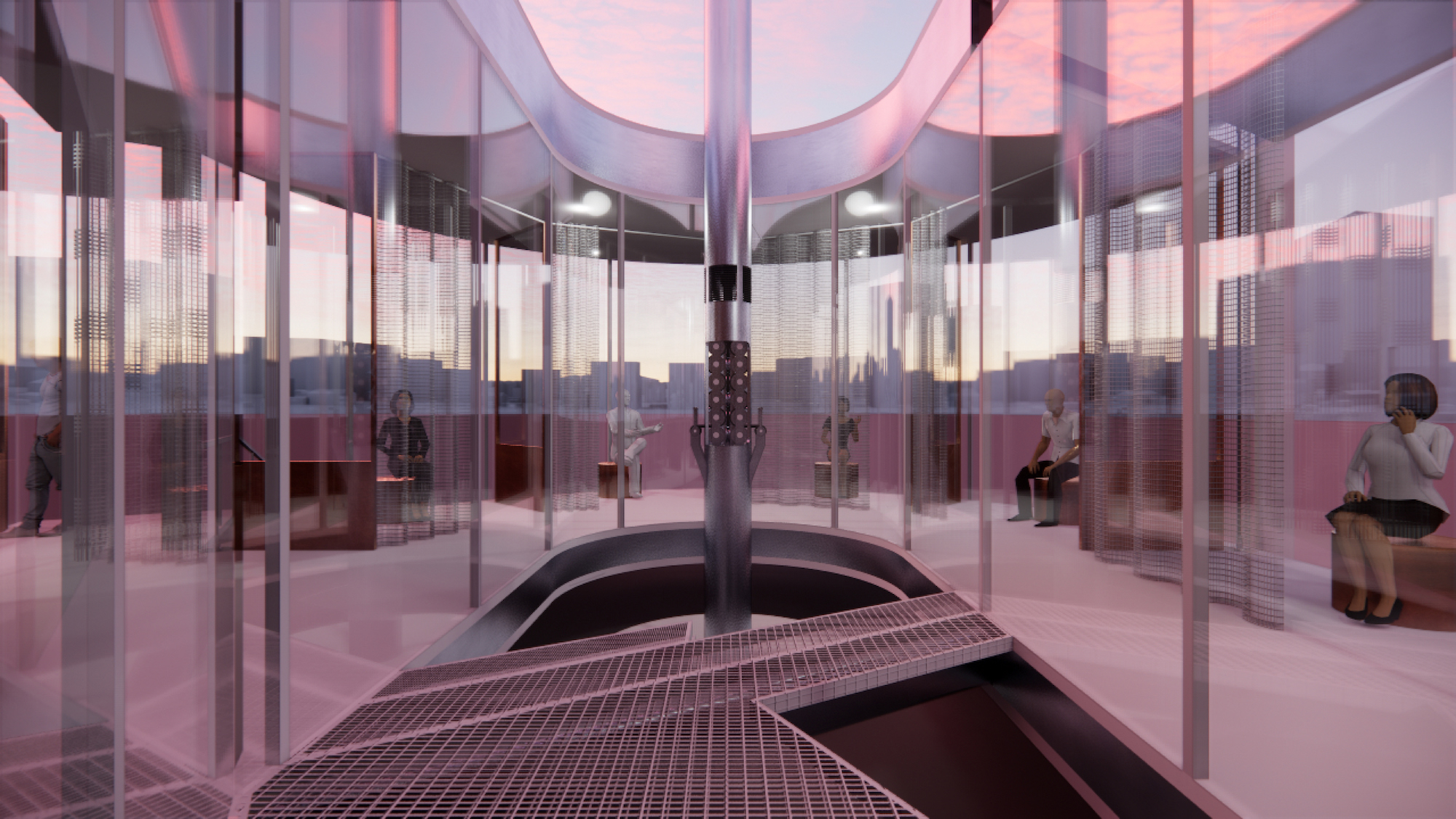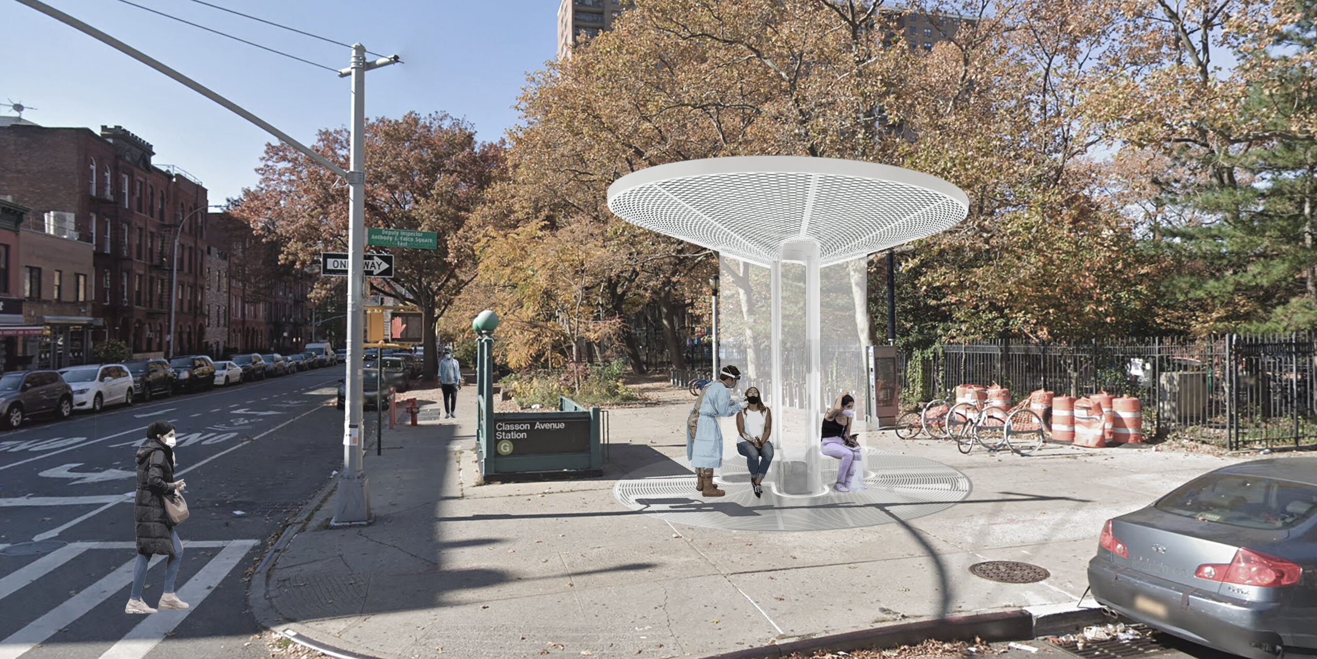 Where in a region like the American southwest, a totally open structure might be an all-season solution, for more variable climates like New York’s, Pendleton had to think through how to harness warmth for comfort while allowing natural circulation. A glass column anchors each pavilion, with niches around the hub for patients to sit, connecting a canopy and grill flooring (inspired by the MacPro’s cheese-grater-like ventilation panel). Solar panels on the roof power heating coils in the base, creating a zone of warmth and protection without walls.