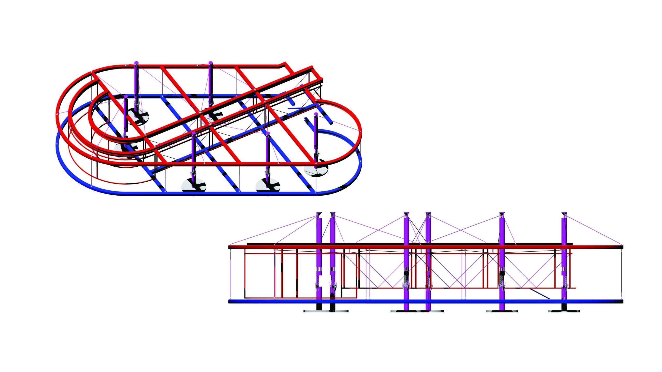 The airflow system isn’t the only element that Sutton sought to streamline. Taking into account the variable ground conditions of a potential building site—and, with time at a premium, the need to avoid requiring a foundation—Sutton devised a suspension system. Builders could hoist the structure up on a series of masts, further reducing the tools a team would need to complete the build.