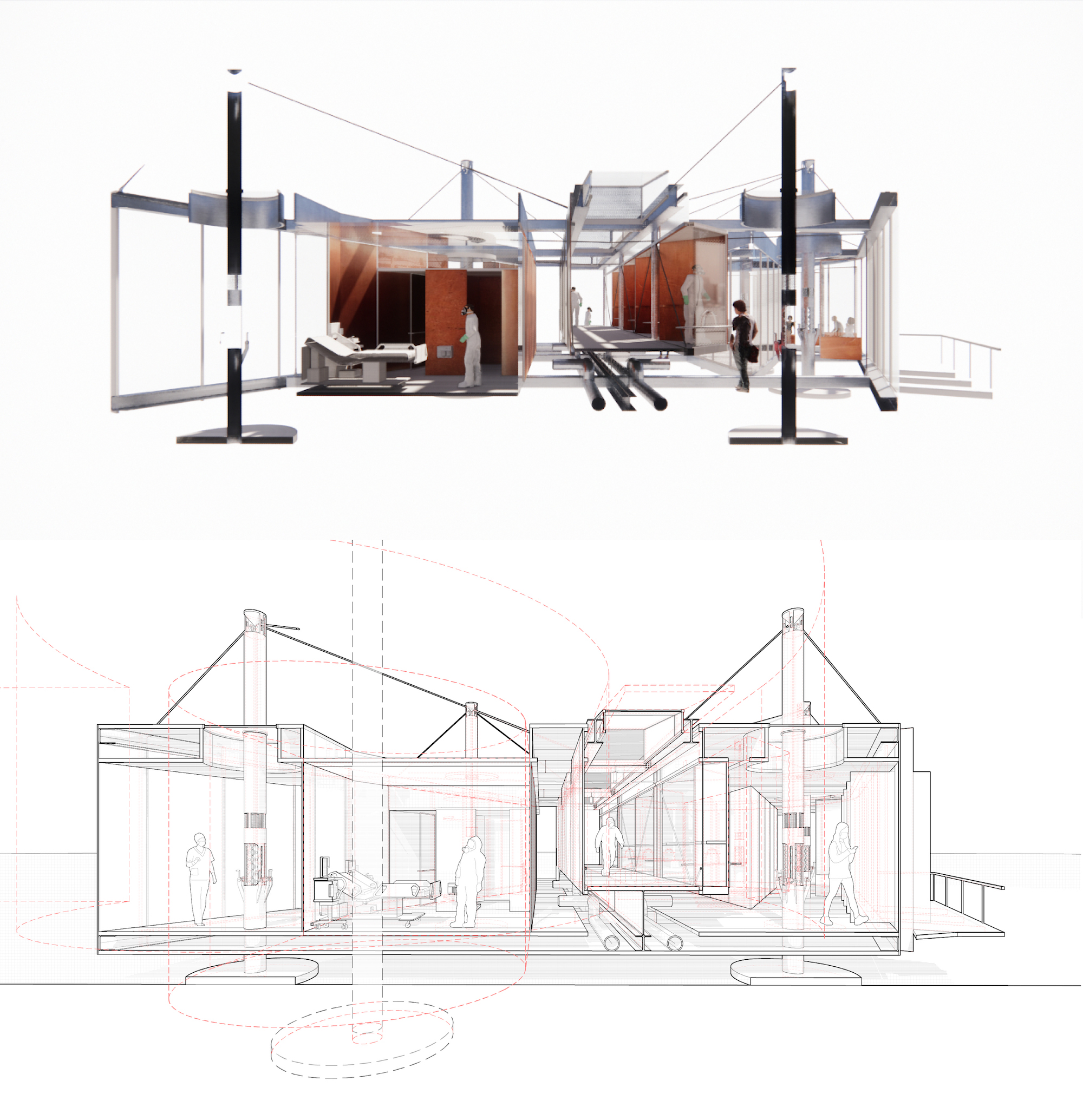 “To occupy the valve or the machine creates a new relationship between the public and the clinic in a pandemic,” Sutton said in the final review presentation. The architecture itself accrues new meaning as a device that protects its inhabitants through invisible means made visible through its specific forms.