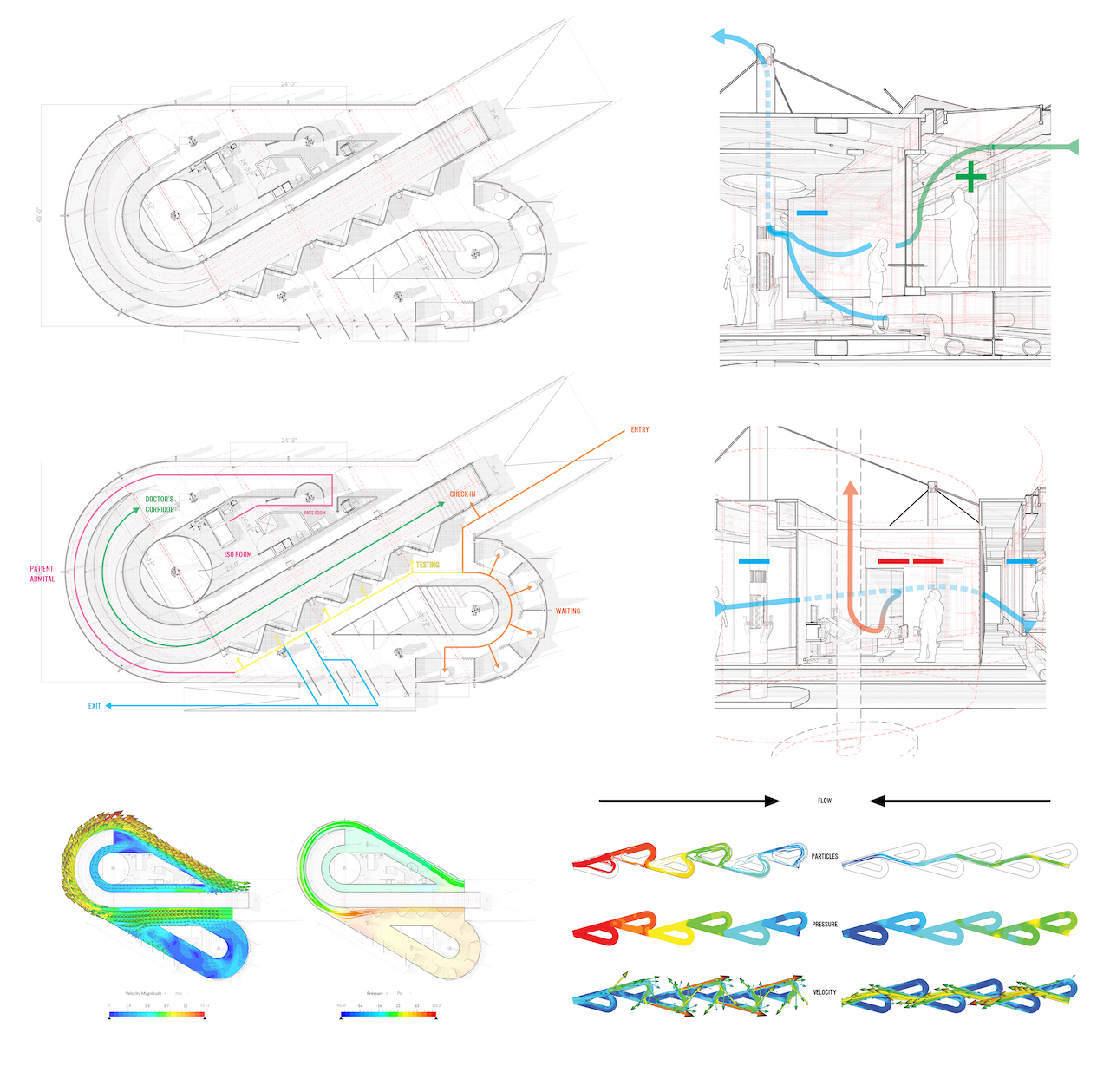 Patients would enter the transparent structure on one side of the spine and wait in a naturally ventilated nook in one of its loops. Divots for testing fall along one corridor of negative pressure, and ill patients would move around another loop, into an isolation room separated from the corridor by an anteroom, to contain and flush contaminated air.