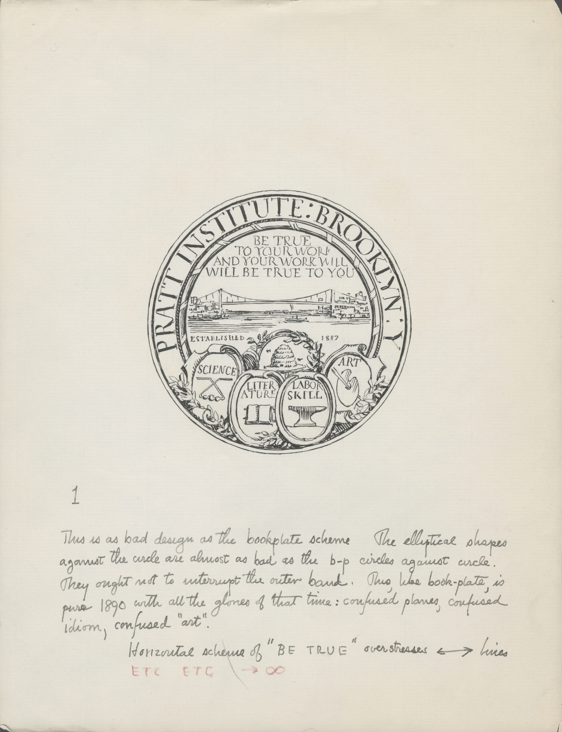 Because of our curiosity around the logo—especially on the heels of the visual identity refresh recently undertaken by Pratt Creative Services—Fontánez Rodríguez also shared records from the Charles Pratt Papers related to Pratt’s seal. Not only were there the original sketches of the seal but pages of critical appraisal, notably from graphic design heavyweight W. A. Dwiggins, who was called upon in the 1930s to design a bookplate using the seal.