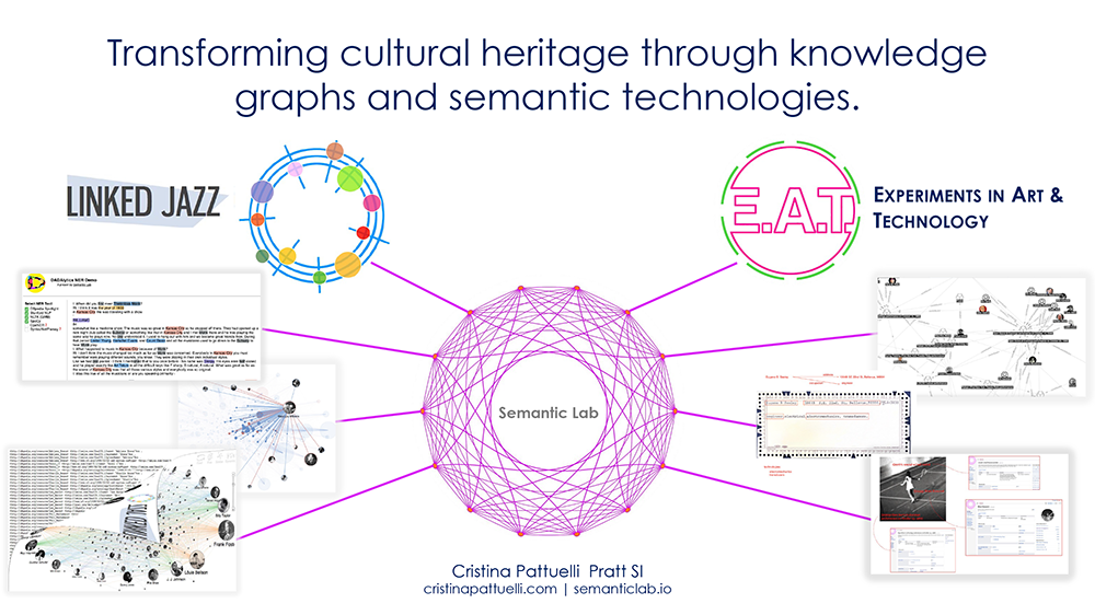 Cristina Pattuelli’s research is driven by a fundamental question: what happens when cultural knowledge is freed from the containers that have long defined its boundaries — the catalog record, the finding aid, the institutional collection? She applies semantic methods to create knowledge graphs that model cultural and historical material as dynamic, relational systems, making visible the networks of artistic collaboration, influence, and exchange, and the works they produced, that conventional representation systems cannot surface. Linked Jazz transformed jazz oral histories into a graph of professional and personal connections among musicians, revealing a rich web of relationships that no traditional access system could expose. A dedicated strand of this work, Women of Jazz, foregrounds the contributions of women musicians whose presence in the historical record has been long neglected. This work has since expanded into the E.A.T. Knowledge Graph, in collaboration with the Robert Rauschenberg Foundation Archives, which maps the interdisciplinary ecosystem of Experiments in Art and Technology — the pioneering 1960s initiative that brought together artists and engineers at the frontier of creative and scientific practice. These are among the many projects carried out through the Semantic Lab at Pratt’s School of Information, a research collective where students and alums engage in the full research process.
